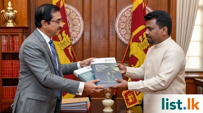 The Central Bank of Sri Lanka today presented its “Annual Economic Review 2025” and “Financial Statements and Operations 2025” reports to President Anura Kumara Dissanayake at the Presidential Secretariat. The reports were formally handed over by Central Bank Governor Dr. P. Nandalal Weerasinghe. President Dissanayake received the documents in his capacity as the Minister of Finance, Planning, and Economic Development. The Annual Economic Review 2025, a flagship publication, highlights the sustained progress in macroeconomic stability and ongoing policy and structural reforms. It also underscores the strengthening of the Sri Lankan economy based on achievements from previous years.