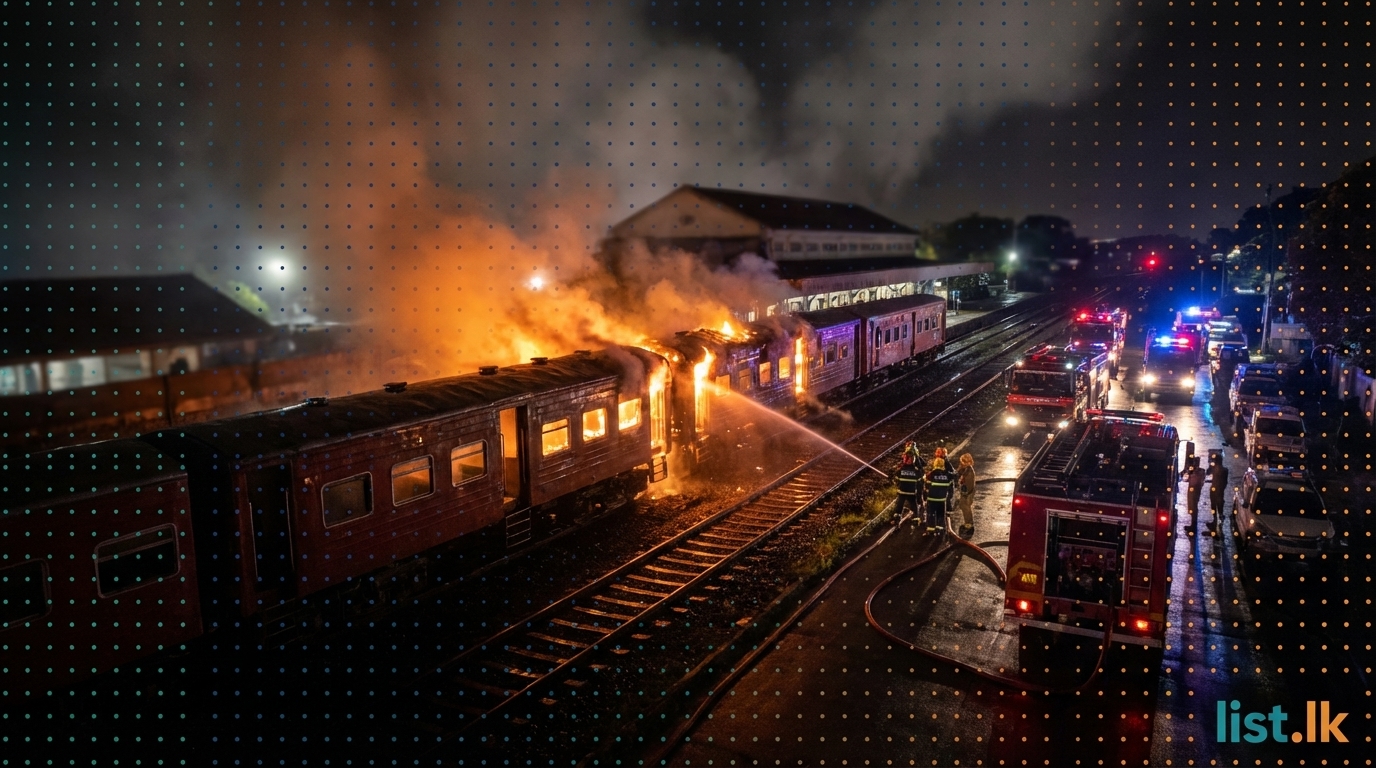 A fire erupted in two decommissioned train compartments parked near the Galle Railway Station on the evening of March 31, 2026. These carriages were part of a group of four out-of-service compartments stationed in the area. Firefighting units, including those from the Galle Municipal Council, were dispatched to the scene to extinguish the blaze, which was confined to the two affected compartments. Authorities confirmed that no injuries or casualties were reported in the incident, and the cause of the fire remains unknown as investigations are underway.