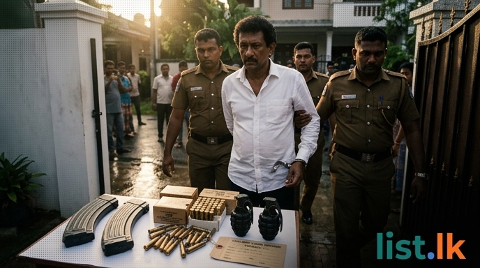 Former Parliamentarian Chandana Kathriarachchi was arrested by the Colombo Crime Division on April 16, 2026, after a search of his Piliyandala residence. Police confirmed the discovery of two T56 magazines, over 221 rounds of T56 ammunition, and two live hand grenades during the operation. Police Media Spokesperson Assistant Superintendent of Police F. U. Wootler stated the search was conducted based on a warrant obtained from the Kesbewa Magistrate's Court, following intelligence regarding the presence of firearms. Kathriarachchi was subsequently taken into custody.