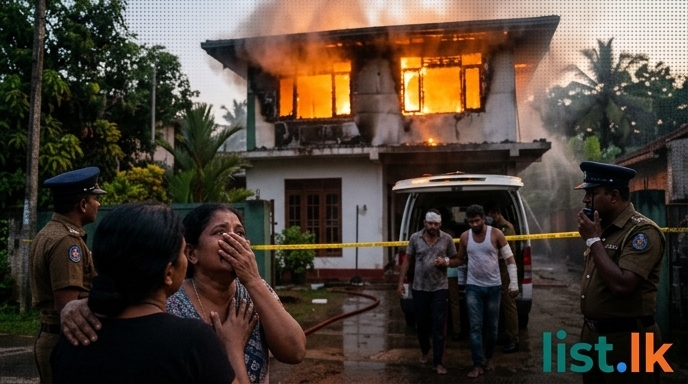 A mother and her teenage daughter were killed, and two men were seriously injured, after the upper floor of their rented two-story house in Maharagama was set on fire by unidentified individuals. The incident occurred yesterday, April 18th, on Pamunuwa Road, Eksath Suba Sadaka Mawatha. The deceased were identified as 55-year-old H.B. Rathnakanthi Wickramarachchi and her 16-year-old daughter S. Tassarani Rathnayake. The girl's 46-year-old father and the 76-year-old house owner sustained severe burn injuries and were hospitalized. Neighbors reportedly intervened to extinguish the blaze and assist the injured, with Maharagama Police currently investigating the incident.