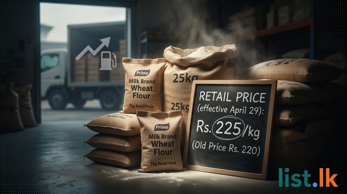 Prima, a leading flour manufacturer, has announced an increase in the price of its Prima Milk Brand wheat flour, effective April 29. The price of a kilogram of this flour has risen by Rs. 5, bringing the new retail price to Rs. 225 per kilogram, up from its previous price of Rs. 220. The company attributed this adjustment primarily to escalating transport costs, with one source also mentioning increased production expenses. This price revision impacts flour widely utilized in the bakery industry across the island, as communicated to the company's sales agents.
