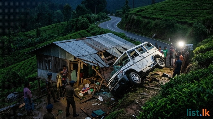 A Bolero-type vehicle veered off the Nuwara Eliya main road and overturned onto a house in the Kirimetiya area around 11 PM on April 25th. The incident occurred while the vehicle was traveling from Nanuoya towards Nanuoya Kirimetiya, specifically on the route via Talawakelle Desford. Nanuoya Police reported that the accident was caused by the vehicle traveling at high speed when its brake system suddenly failed. As a result, three individuals – the driver and two front passengers – sustained injuries. Both the vehicle and the house involved in the crash also suffered damage.