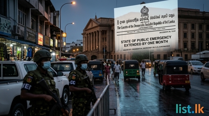 Sri Lanka's State of Public Emergency has been extended by one month, as confirmed by a gazette notification issued by Presidential Secretary Dr. N. S. Kumanayake yesterday. The decision was made in response to the disaster situation caused by Cyclone Ditwah, which necessitated the initial declaration on November 29th. This extension aims to ensure public safety, maintain normalcy across the country, and guarantee the continued supply of essential services vital for daily life. Concurrently, the gazette also re-designates services provided by state corporations, government departments, and local authorities as essential.