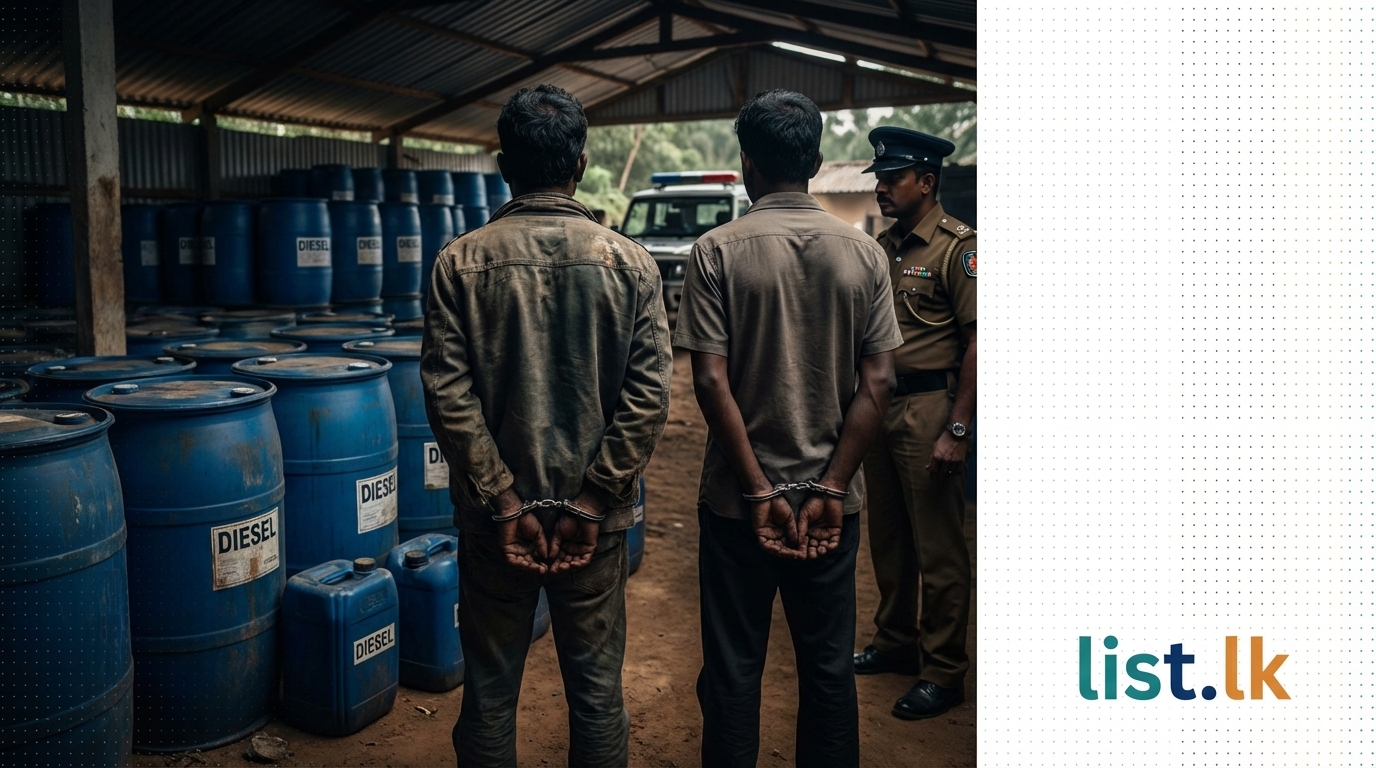 Two individuals were arrested on April 2 in the Mollipothana area of Thambalagamuwa for illegally possessing a large quantity of diesel. Acting on tip-offs, Thambalagamuwa Police conducted raids at two separate locations, recovering a total of 2,045 litres of diesel held without proper authorization. The suspects, aged 41 and 61, are identified as residents of Trincomalee and Thambalagamuwa. Further investigations into the incident are currently underway.