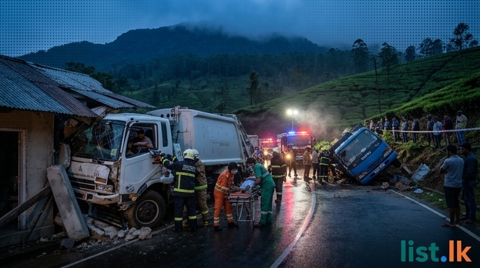 The Nuwara Eliya district has recently experienced two separate lorry accidents, both resulting in injuries and significant damage. In one incident, a Nuwara Eliya Municipal Council tipper truck, reportedly traveling at high speed, experienced sudden brake failure on the Nuwara Eliya-Udupussellawa main road near the Forest Conservation Office. The vehicle subsequently crashed into a nearby house, causing severe damage to both the house and the truck. The driver and two workers traveling in the tipper sustained serious injuries and were admitted to the Nuwara Eliya District General Hospital.
